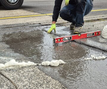 La résine liquide remplit les vides et compacte le sol meuble pour créer un substrat solide. La force d'expansion de la mousse PU combinée à la pression d'une pompe spécialisée génère une force contrôlée suffisante pour soulever presque n'importe quelle structure et la remettre en place avec une grande précision de quelques millimètres. Ce résultat peut être obtenu pour une fraction du coût et du temps qu'il faudrait pour remplacer la structure de soutien en béton.